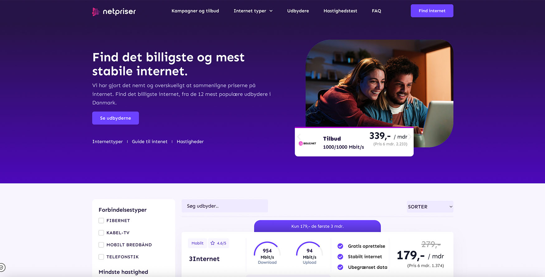 Netpriser.dk er et prissammenligningssite for internetløsninger og udbydere. Her sammenlignes bredbånd, fibernet, mobilt bredbånd mv. på tværs af alle danske udbydere.